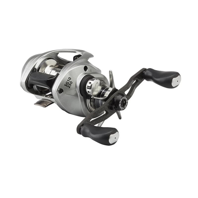 Ideal für Hechte mit mittleren Ködern, aber auch Zander und Barsche mit kleineren, leichteren Ködern. Wenn Sie SG10 einmal ausprobiert haben, werden Sie nie mehr zurückblicken. Besides the obvious impressive features, such as 10+1 stainless steel ball bearings, a machined gear, DuraGrease and a super strong and rigid aluminium body and side plate, the real standout highlight is the external centrifugal brake. This brake results in easier casting and playing fish, increased casting distance, a reduc- tion in knots and tangles and less trouble when casting in strong crosswinds. This reel series is also versatile – capably of casting lures from five grams and upwards, making it ideal for black bass and pike with medium lures and also zander and perch with smaller, lighter lures. Once you try the SG10, you’ll never look back.• EDP-lackierter Aluminiumrahmen und Seitenplatten• Präzise Bremseinstellung • Rollenfuß aus Edelstahl bei Größe 250 • Externe Fliehkraftbremse• Dura-Grease-Schmierung• 9+1 Stahlkugellager (einschließlich zwei japanische ARB-Kugellager)• Carbon-Griffknauf• Hartanodisierte Schneckenwelle aus A7075-Aluminium• Zwei verschiedene Übersetzungsverhältnisse verfügbar• Schnur-ID• Klappbare Seitenplatte bei der Größe 100