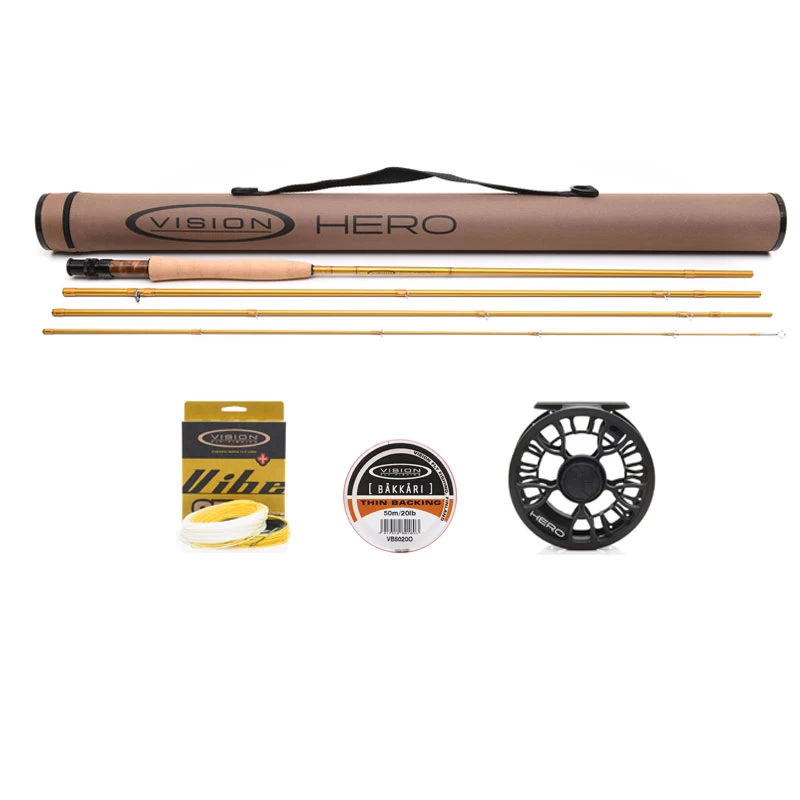 Rod – Vision Hero FlyrodsEin Held am Wasser zu sein, bedeutet nicht, dass Sie die Bank sprengen müssen. Diese erschwinglichen Ruten mit mittelschneller Aktion haben Eigenschaften sowohl für Anfänger als auch für ernsthafte Wettkampfangler. Alle Ruten sind fein abgestimmt auf die Art der Fischerei, bei der sie am ehesten eingesetzt werden. Egal, ob Sie ein Superheld an vielen Gewässertypen sein wollen, ein Nymphing-Held oder die Herrschaft an Stillgewässern, diese Ruten haben die Aktionen und Komponenten für den Job.Mittelschnelle AktionVierteilige RutenVivid Yellow Blanks mit schwarzen MarkierungenHalf-Wells-Griff bei leichteren ModellenVoller Wells-Griff mit einem Fighting Butt in den schwereren ModellenGelbes rundes Cordura-RohrReel – Vision Hero ReelVision Hero Reel ist eine coole und erschwingliche Familie von Rollen, die aus einem Stück Aluminium gefertigt sind, um ein Hängenbleiben der Schnur zu verhindern. Erhältlich in verschiedenen Größen, die perfekt zu Ihrem Angeln passen!Nymph & Dry – Diese Hero ist die ideale Rolle für Ruten #3 – #5, wenn Sie Standard-WF- oder spezielle Nymphing-Schnüre verwenden. Sie hat eine große Bohrung für schnelles Einholen der Schnur und ihre schmale Spule spult die Schnur gut ab. Der Vollkörperrand verhindert, dass die dünnen Nymphing-Schnüre an die falschen Stellen rutschen. Diese Rolle balanciert die längeren Ruten perfekt aus.4/6 – Diese Standard-Helden sind echte Allround-Rollen für alle Arten des Angelns. Die 4/6 bewältigt die traditionelle Fluss- und leichtere Stillwasserfischerei mit Leichtigkeit. Sie nimmt WF6F-Fliegenschnur mit genügend Backing auf und ihr Gewicht ist so abgestimmt, dass sie gleich schwere Ruten ausbalanciert.Line – Vision VIBE 85+ FlytDie Vibe 85+ ist superglatt und bleibt auch bei wärmeren Bedingungen so. Wir haben außerdem Schnurkennzeichnungsaufdrucke in der Spitze angebracht. Die Vibe 85+ hat einen 8,5 Meter / 27,9 Fuß langen Kopf. Sie ist am besten an Orten mit begrenztem Wurfraum zu gebrauchen und macht sich extrem gut bei Switch- und Spey-Würfen. Der dehnungsarme Kern hilft Ihnen, die Takes zu spüren und überträgt die Wurfenergie besser als normale Kerne. Das aggressive Front Taper dreht auch schwerere Nymphen und Streamer mühelos um. Die vorgefertigte Schlaufe im Frontbereich erleichtert das Anbringen des Vorfachs. Die vordere Schlaufe ist außerdem mit einem Aufdruck versehen, um zwischen Gewichten und Dichten zu unterscheiden. Phthalatfrei.Backing – Vision Bäkkäri 50m ORANGE 20lbErhältlich je nach Stärke in 50m, 100m, 150m, 200m, 250m und 2500m Spulen. Extra dünn, gut sichtbar und sehr unwahrscheinlich, dass es sich einschneidet, selbst wenn es bei einem Kampf mit einem großen Fisch stark beansprucht wird.